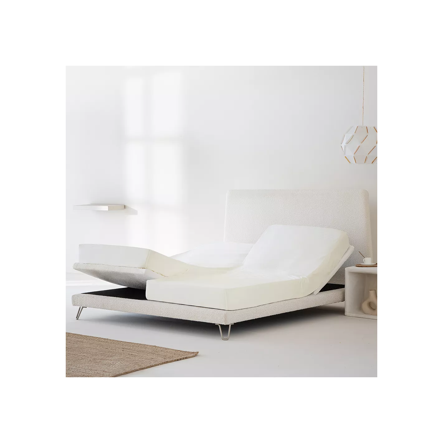 Pensada para camas dobles articuladas, su diseño tipo pantalón permite que cada lado del colchón se eleve o recline con libertad, manteniendo la bajera en su sitio y evitando desplazamientos.
