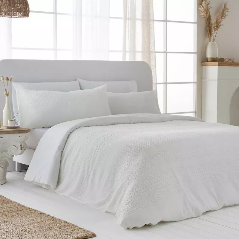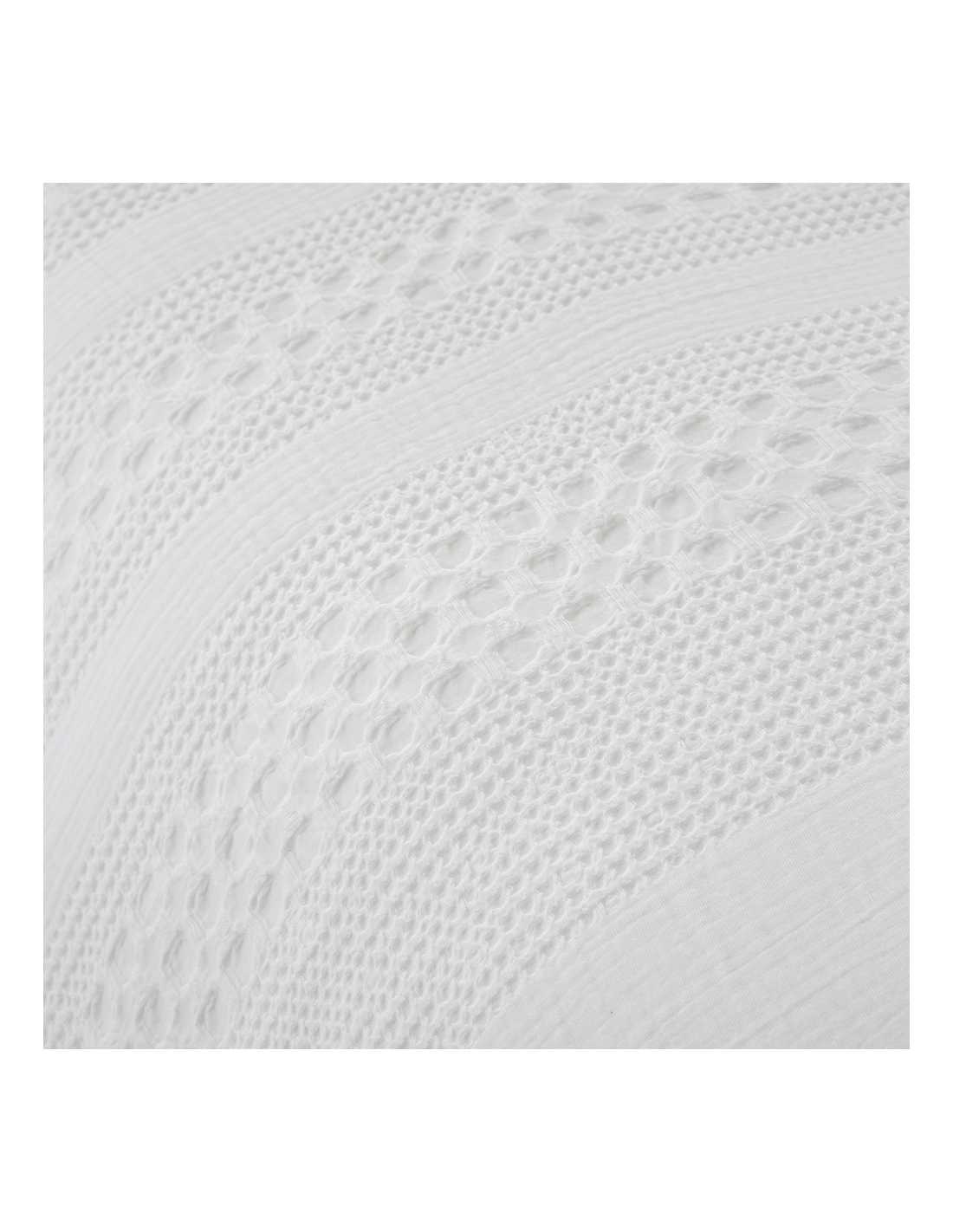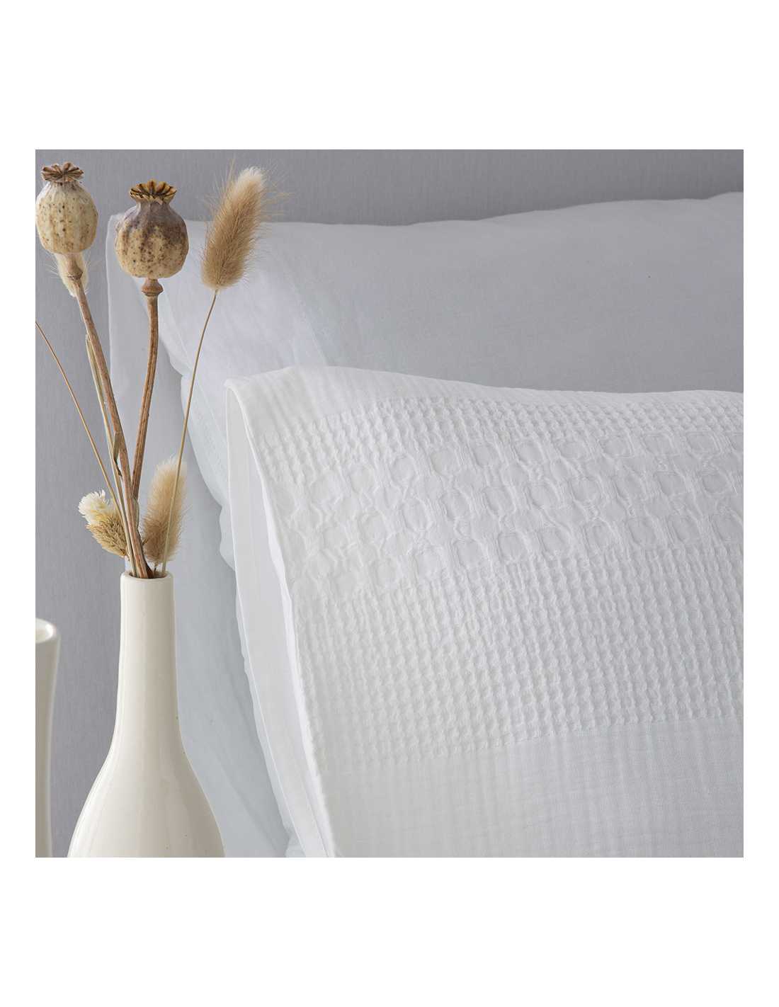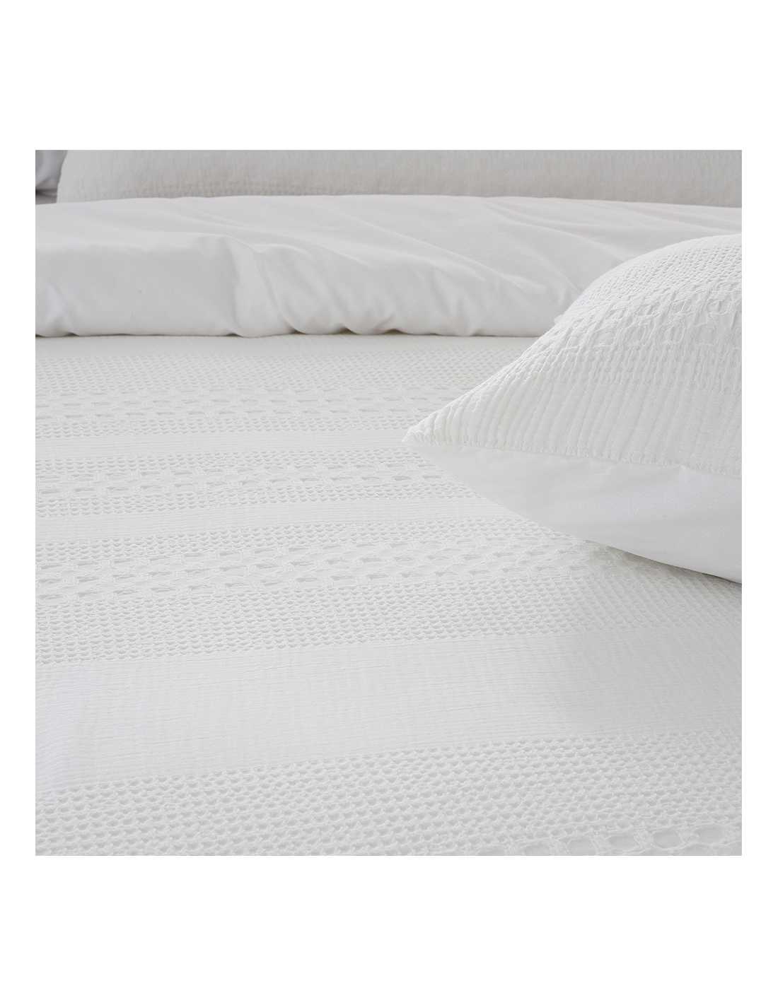 Este tejido presenta un relieve en forma de panal que añade textura y aporta una sensación de confort y calidez al dormitorio.