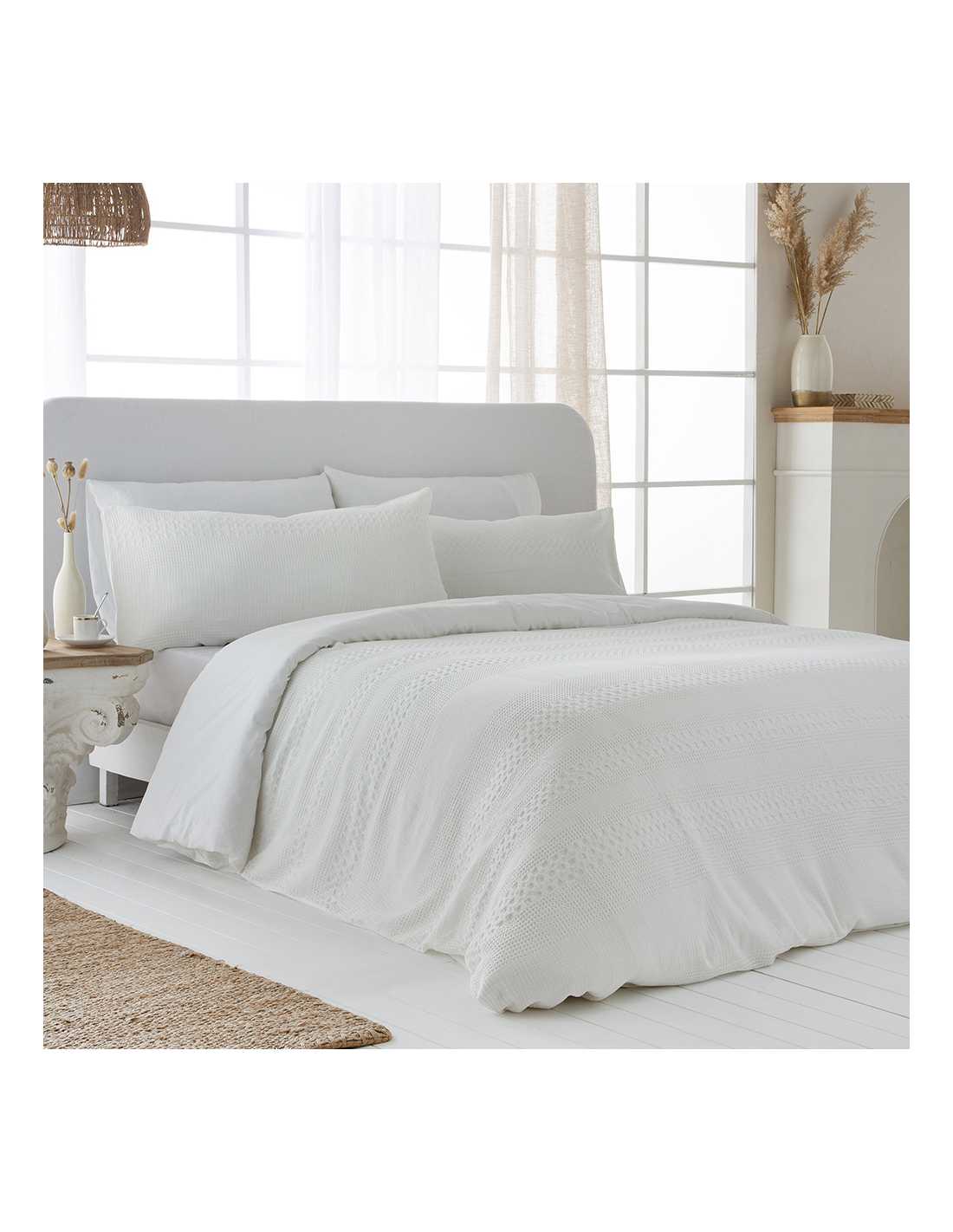 La funda nórdica Larrun está fabricada en 100 % algodón con tejido jacquard waffle (nido de abeja) y 200 hilos.