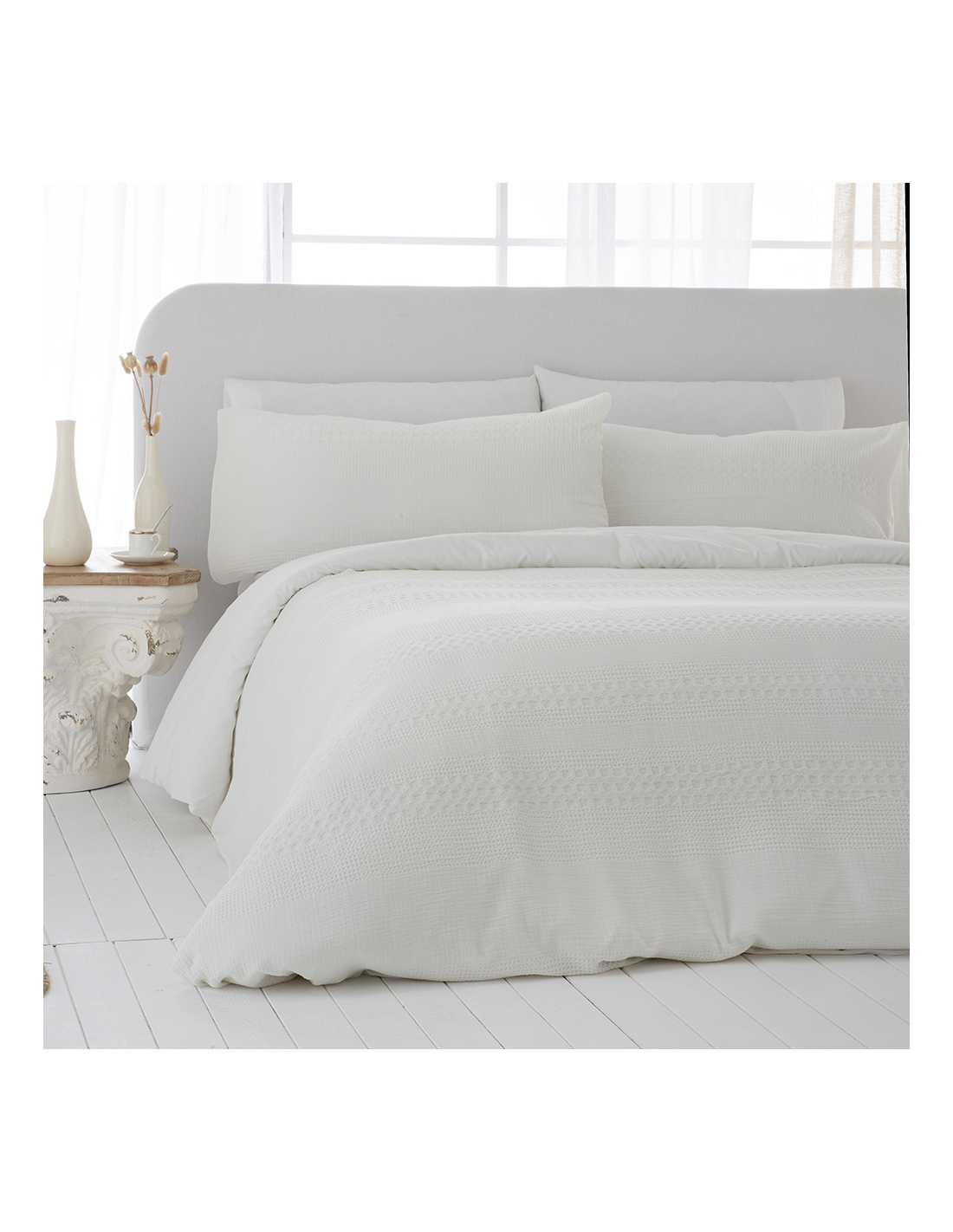 • Algodón jacquard waffle 200 hilos: tejido en relieve que aporta textura y suavidad.