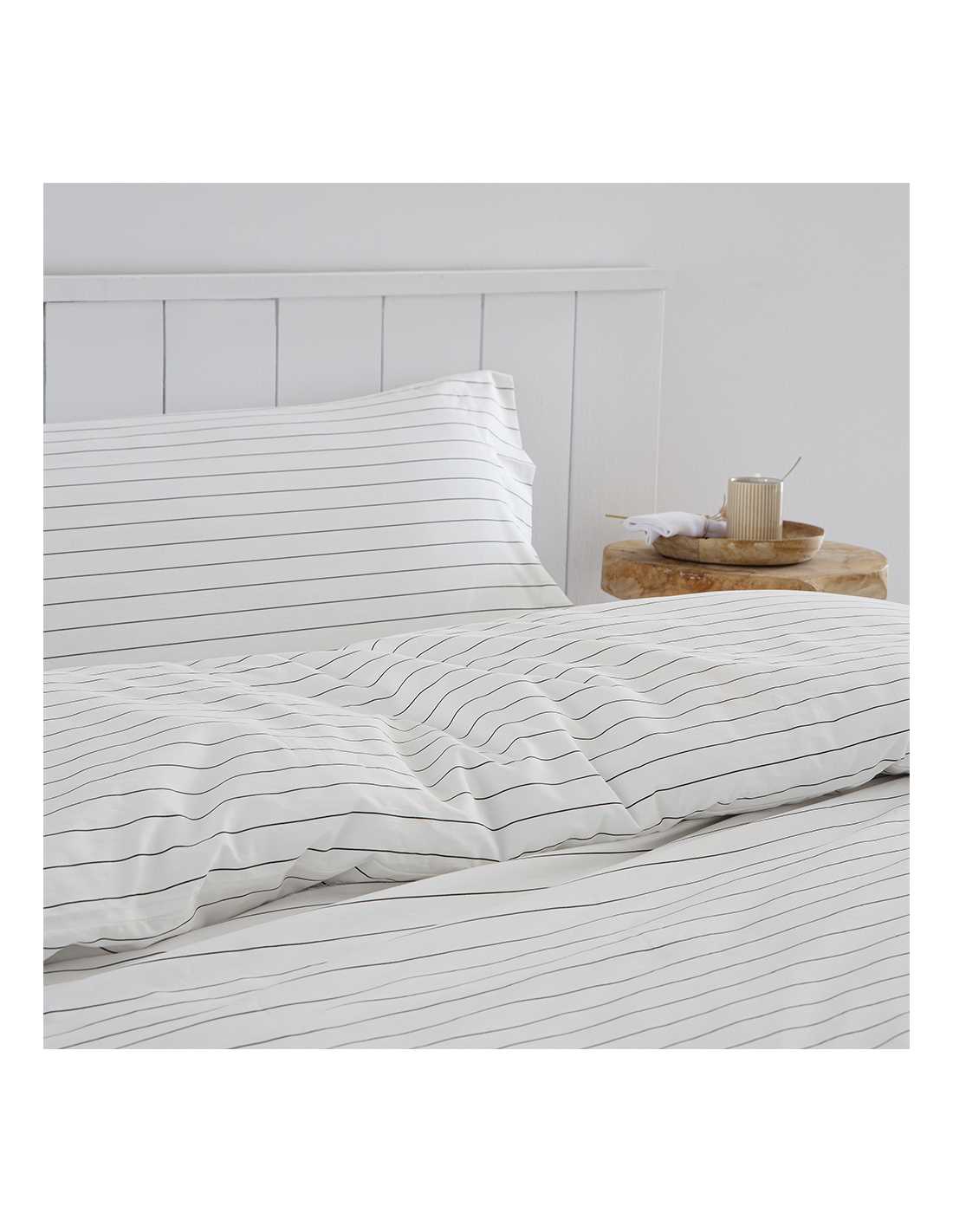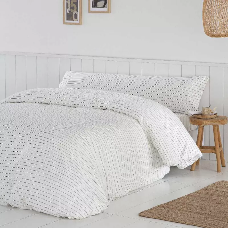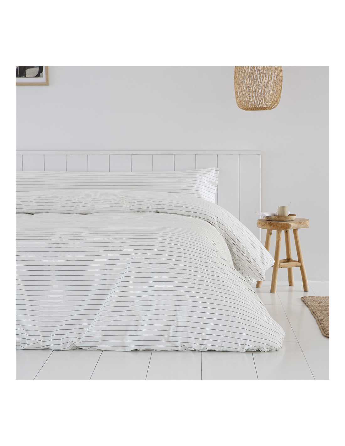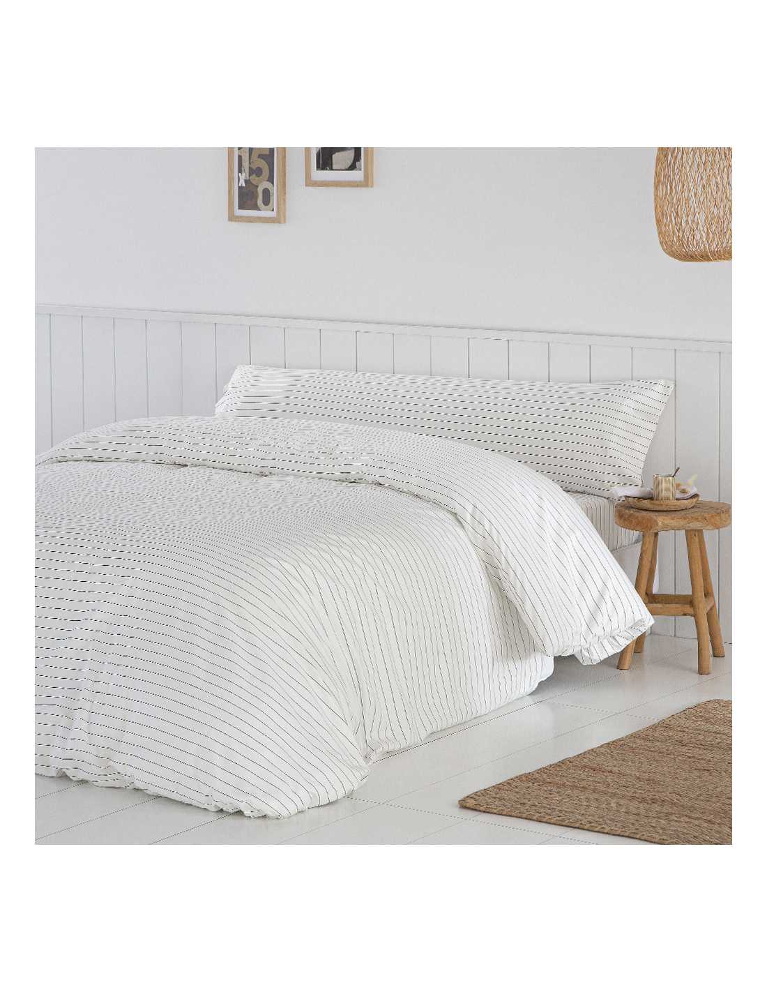 Descubre la funda nórdica Tula, confeccionada en algodón percal 100 % de 200 hilos y teñida en un elegante tono beige con ligeras rayas.