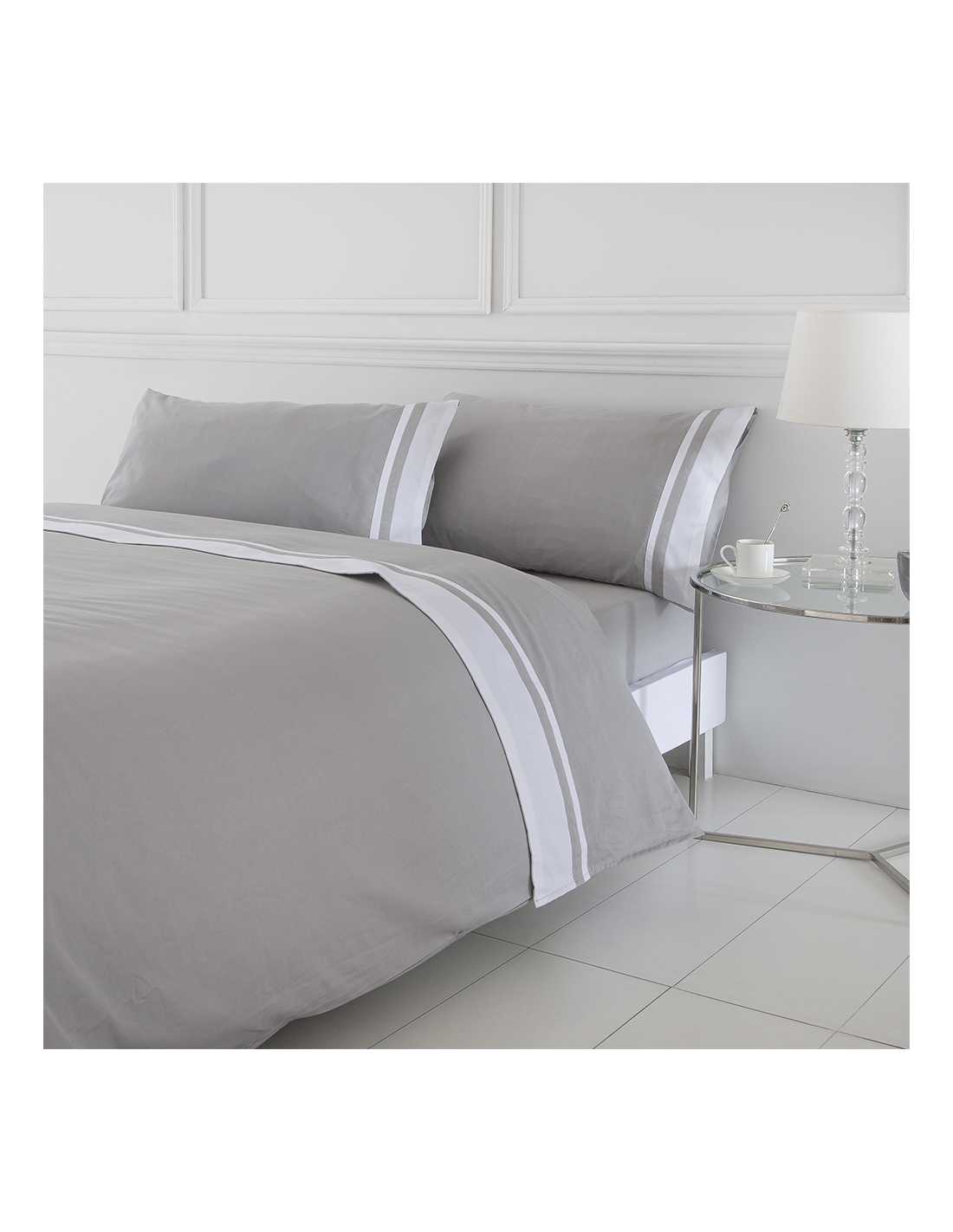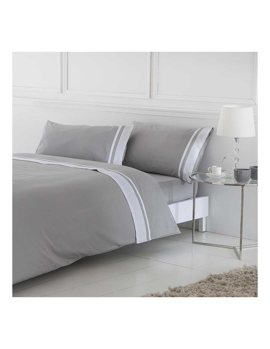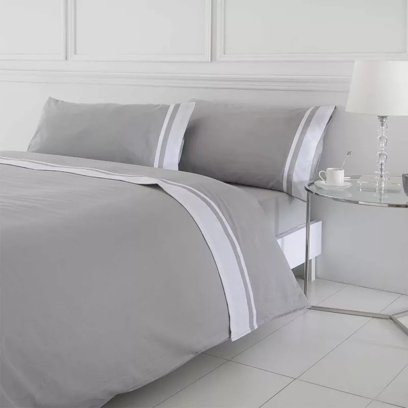 Su color gris con cenefa blanca aporta un estilo minimalista y atemporal que se adapta a dormitorios modernos y clásicos.