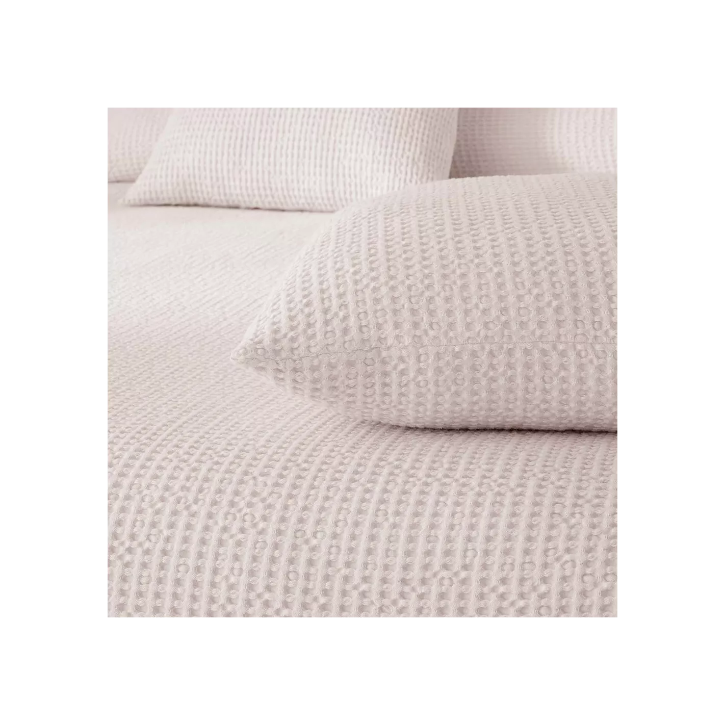 La funda nórdica Ayala está confeccionada en algodón 100 % con tejido jacquard waffle (nido de abeja), un tipo de textura en relieve que recuerda a un panal y aporta volumen y un tacto esponjoso.