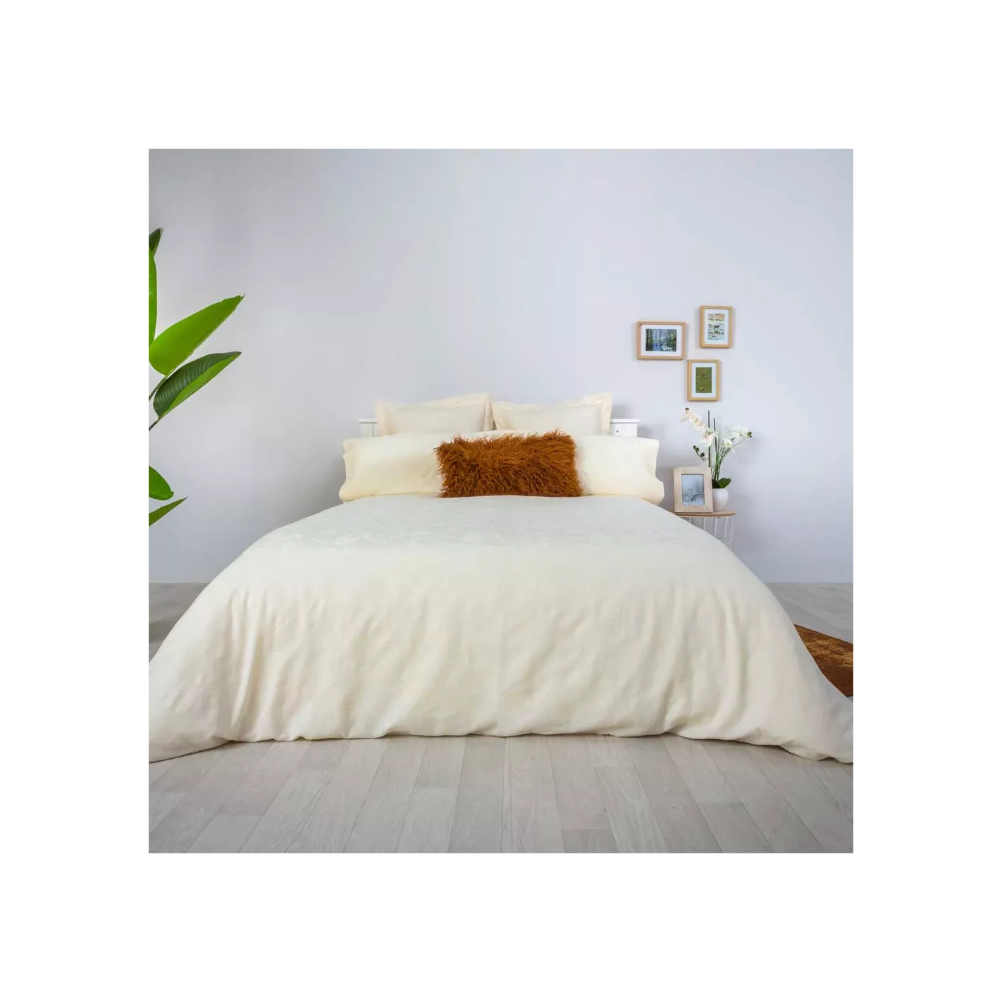 La funda nórdica Floral beige está fabricada en 100 % algodón jacquard con 200 hilos, combinando resistencia y tacto suave.